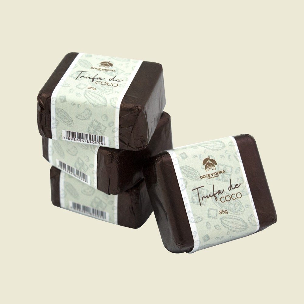 Produto artesanal com receita exclusiva Doce Videira. Uma fina camada de chocolate ao leite, com um recheio cremoso de coco com coco ralado. Trufas Quadradas Doce Videira sabores e texturas que vão te surpreender.